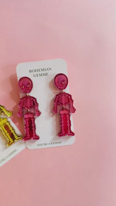 Add a playful touch of spook to your style with our pink skeleton dangle earrings. Crafted from pink mirror acrylic with stainless steel posts and embellished crystal eyes they’re lightweight, comfortable, and perfect for everyday wear. A little eerie, a little cute—these skeletons are ready to haunt your jewelry collection in the best way.